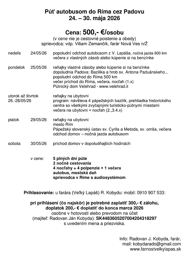 V piatok bude po večernej sv. omši Pobožnosť krížovej cesty v areáli na Lukovom dvore o 19.30 hod. Pozývame vás aspoň raz v pôste sa stretnúť ako farnosť pri spoločnej modlitbe. Preto pobožnosti pred sv. omšou v piatok nebudú. Môžete si priniesť sviečky.