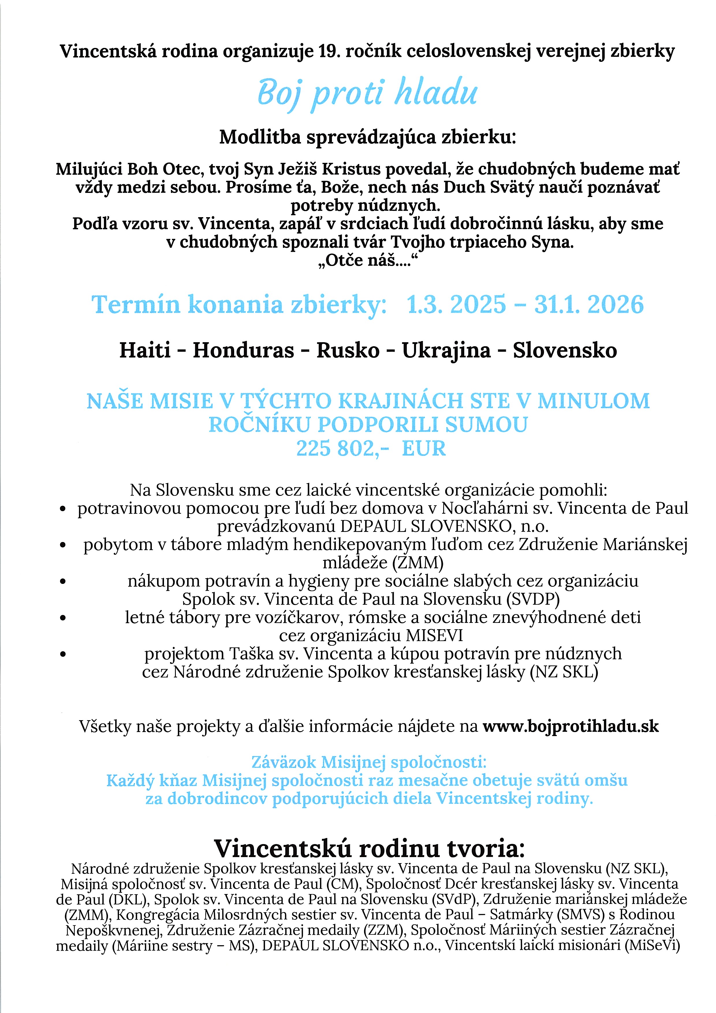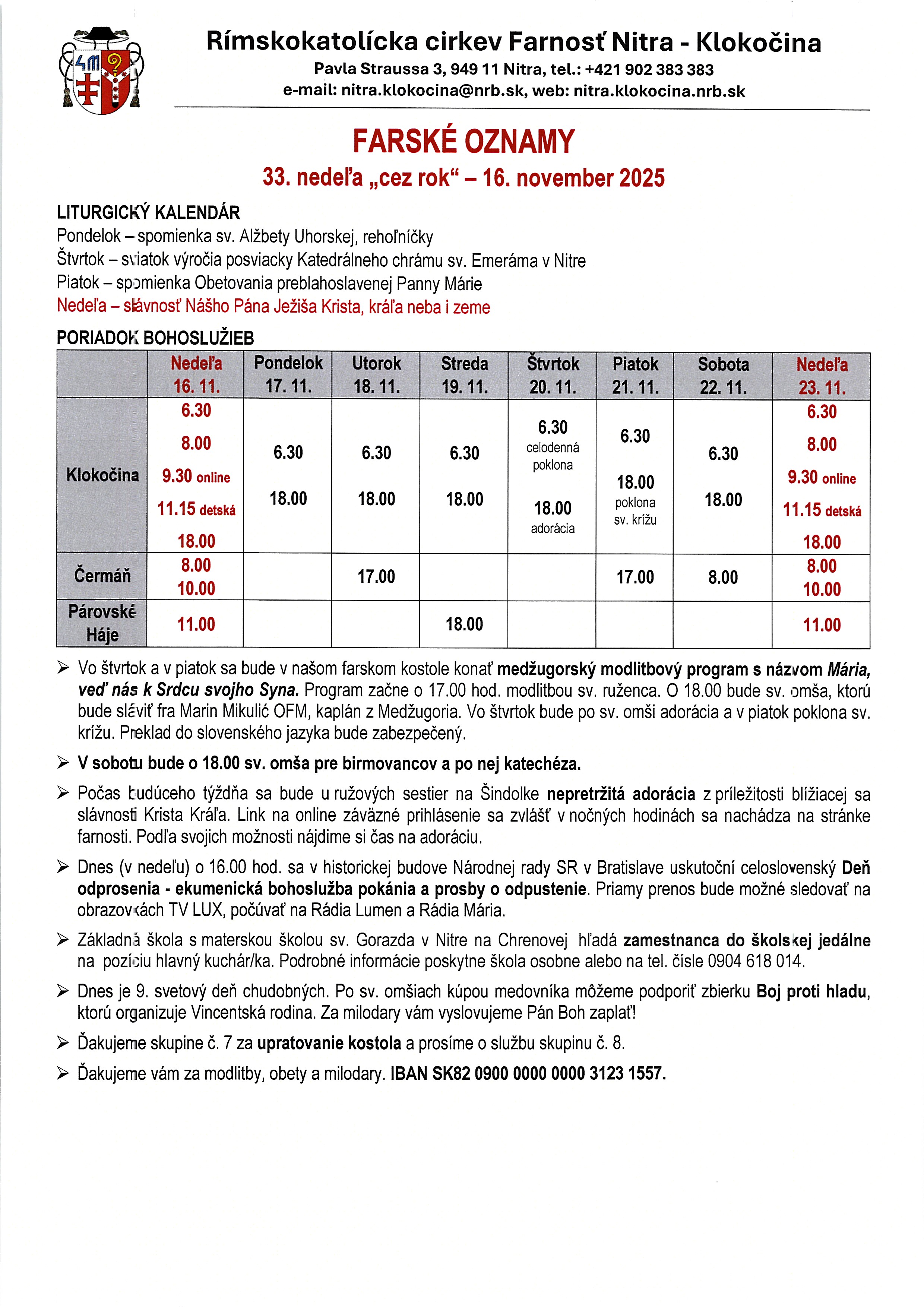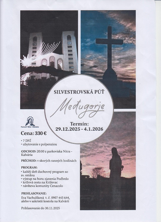 Vo štvrtok a v piatok sa bude v našom farskom kostole konať medžugorský modlitbový program s názvom Mária, veď nás k Srdcu svojho Syna. Program začne o 17.00 hod. modlitbou sv. ruženca. O 18.00 bude sv. omša, ktorú bude sláviť fra Marin Mikulić OFM, kaplán z Medžugoria. Vo štvrtok bude po sv. omši adorácia a v piatok poklona sv. krížu. Preklad do slovenského jazyka bude zabezpečený.