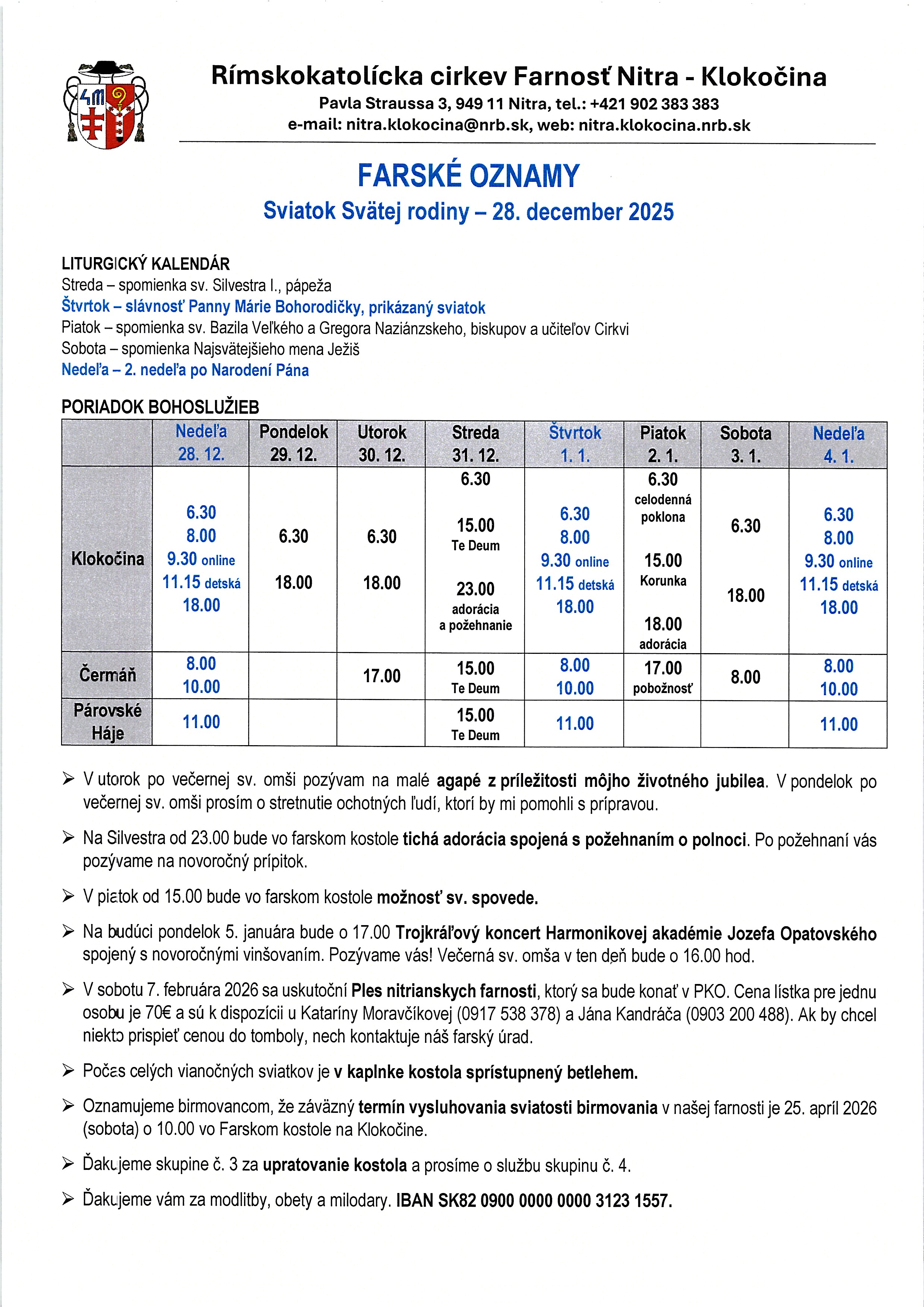 V sobotu 7. februára 2026 sa uskutoční Ples nitrianskych farnosti, ktorý sa bude konať v PKO. Cena lístka pre jednu osobu je 70€ a sú k dispozícii u Kataríny Moravčíkovej (0917 538 378) a Jána Kandráča (0903 200 488). Ak by chcel niekto prispieť cenou do tomboly, nech kontaktuje náš farský úrad.