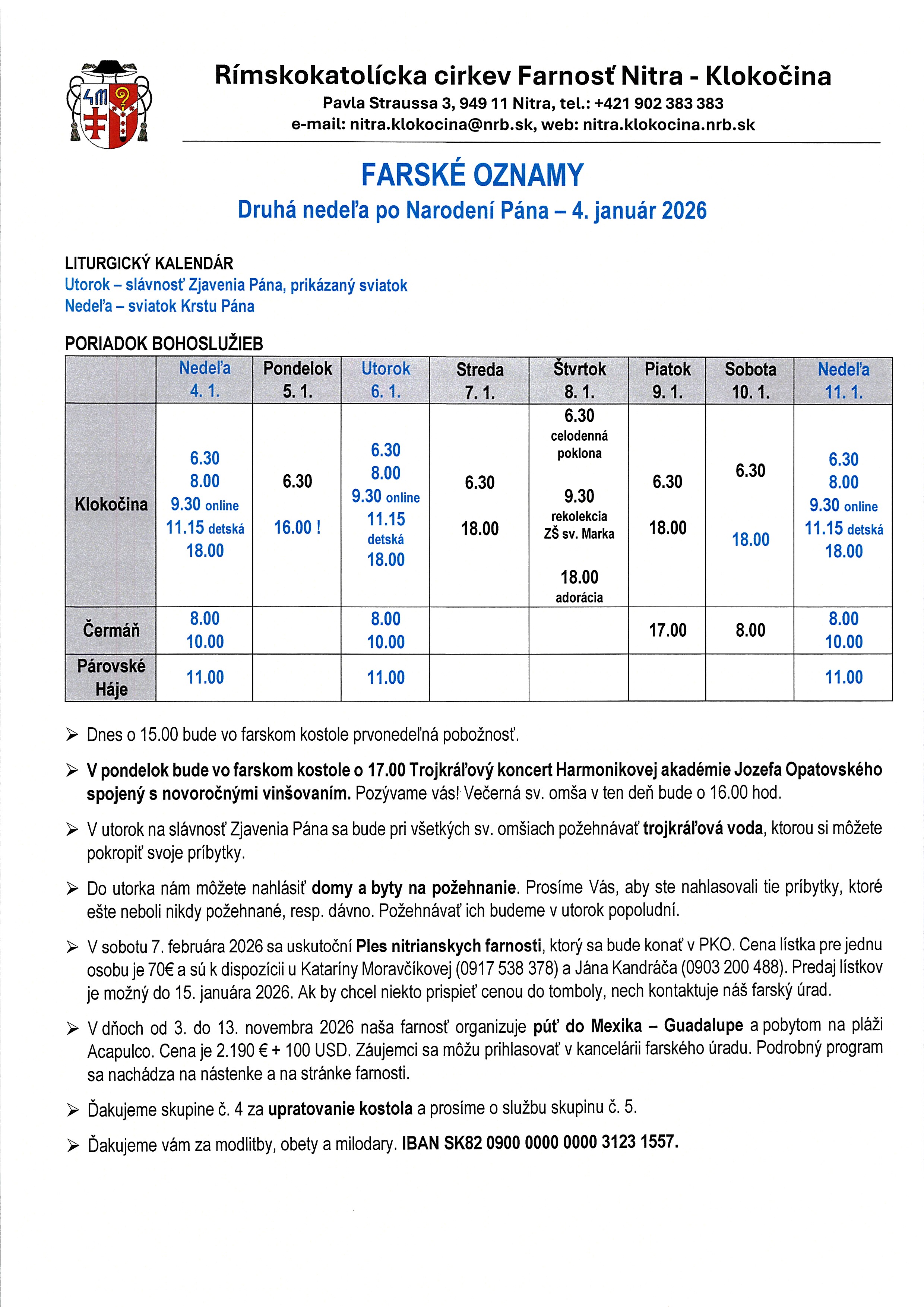 V pondelok bude vo farskom kostole o 17.00 Trojkráľový koncert Harmonikovej akadémie Jozefa Opatovského spojený s novoročnými vinšovaním. Pozývame vás! Večerná sv. omša v ten deň bude o 16.00 hod.
