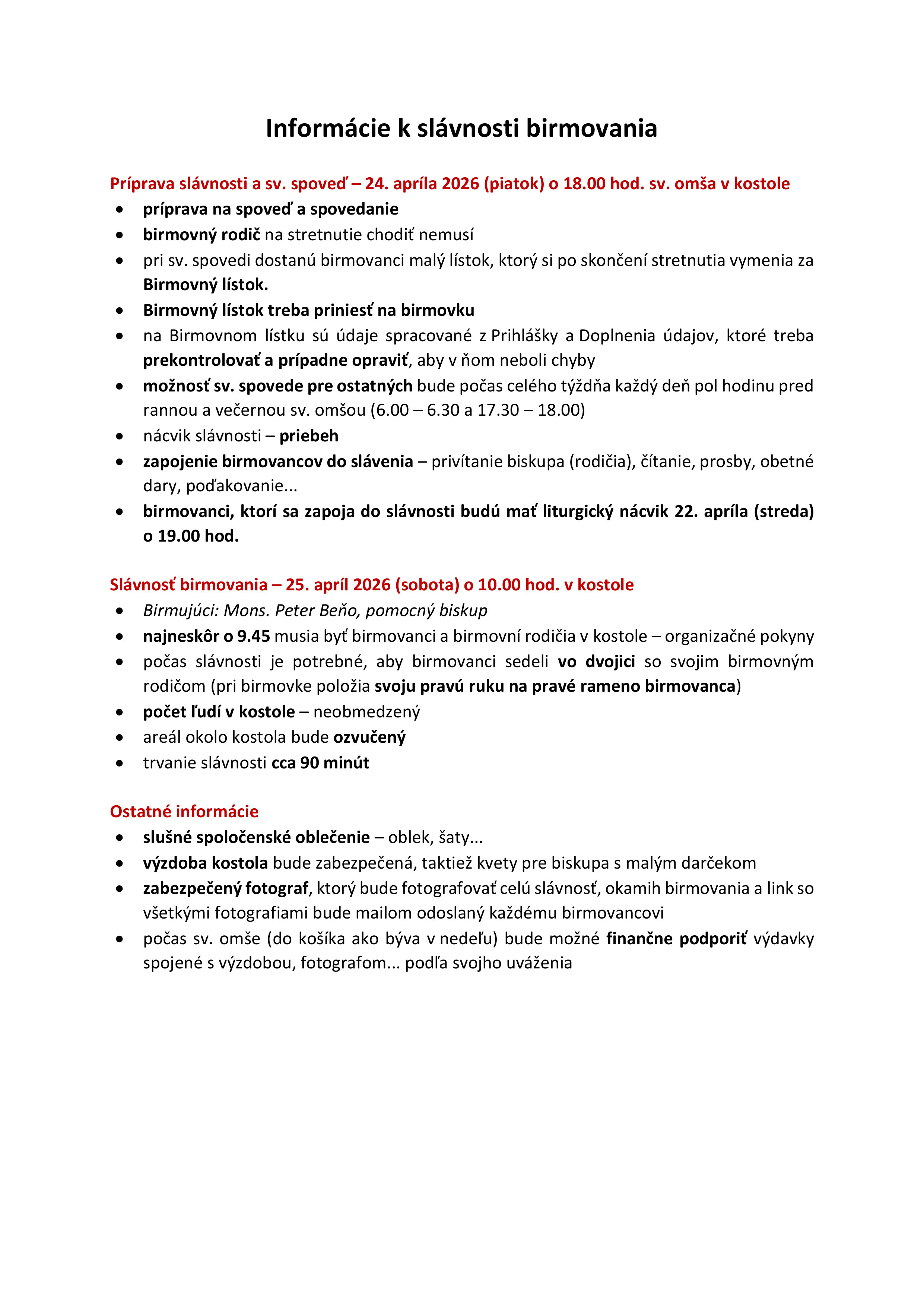 Oznamujeme, že záväzný termín vysluhovania sviatosti birmovania v našej farnosti je 25. apríl 2026 (sobota) o 10.00 vo Farskom kostole na Klokočine.