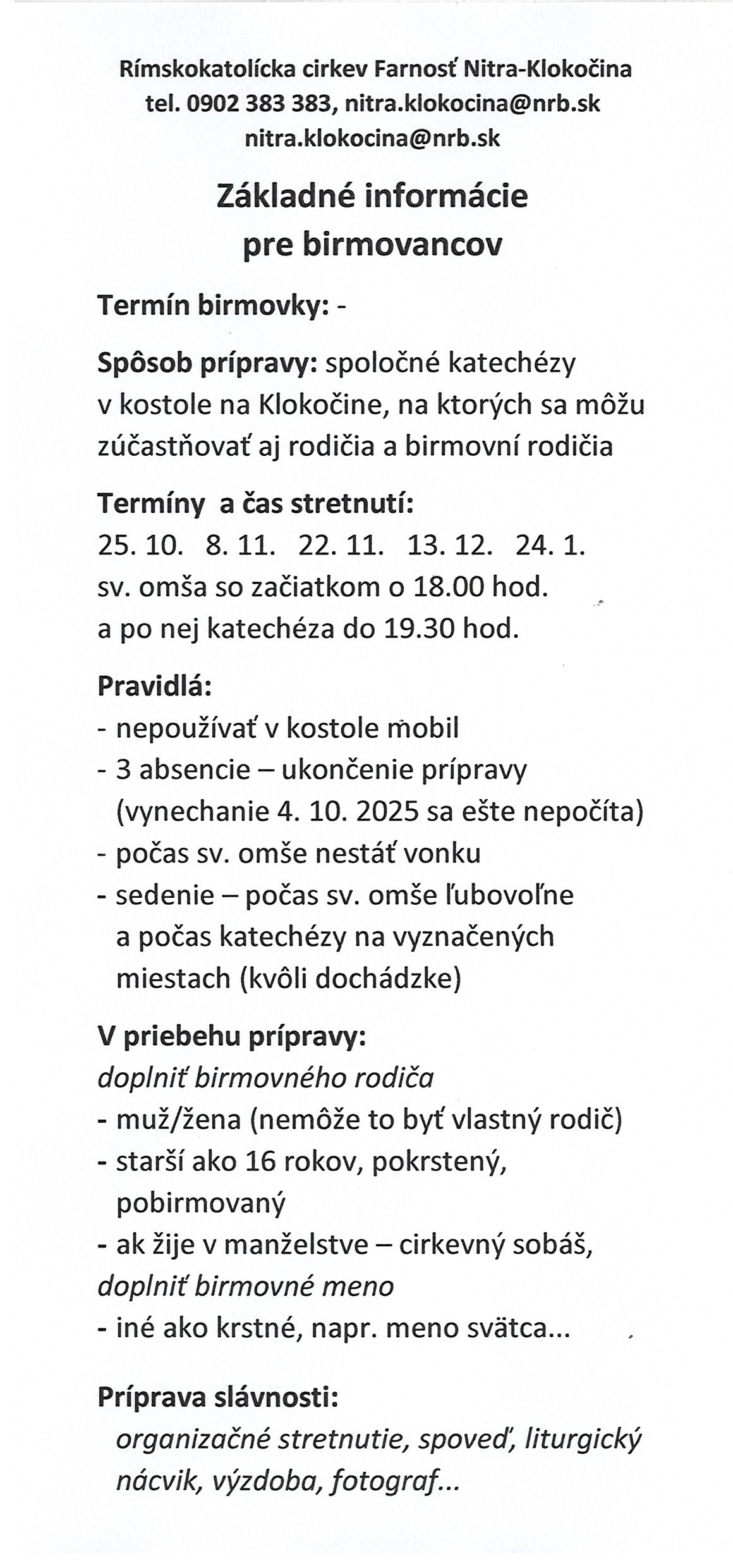 V sobotu 4. októbra 2025 bude vo farskom kostole na Klokočine o 18.00 sv. omša pre birmovancov, ktorí sú prihlásení na birmovku. Po sv. omši bude organizačné stretnutie. Prosíme, aby na stretnutie prišiel s birmovancom aspoň jeden z rodičov.