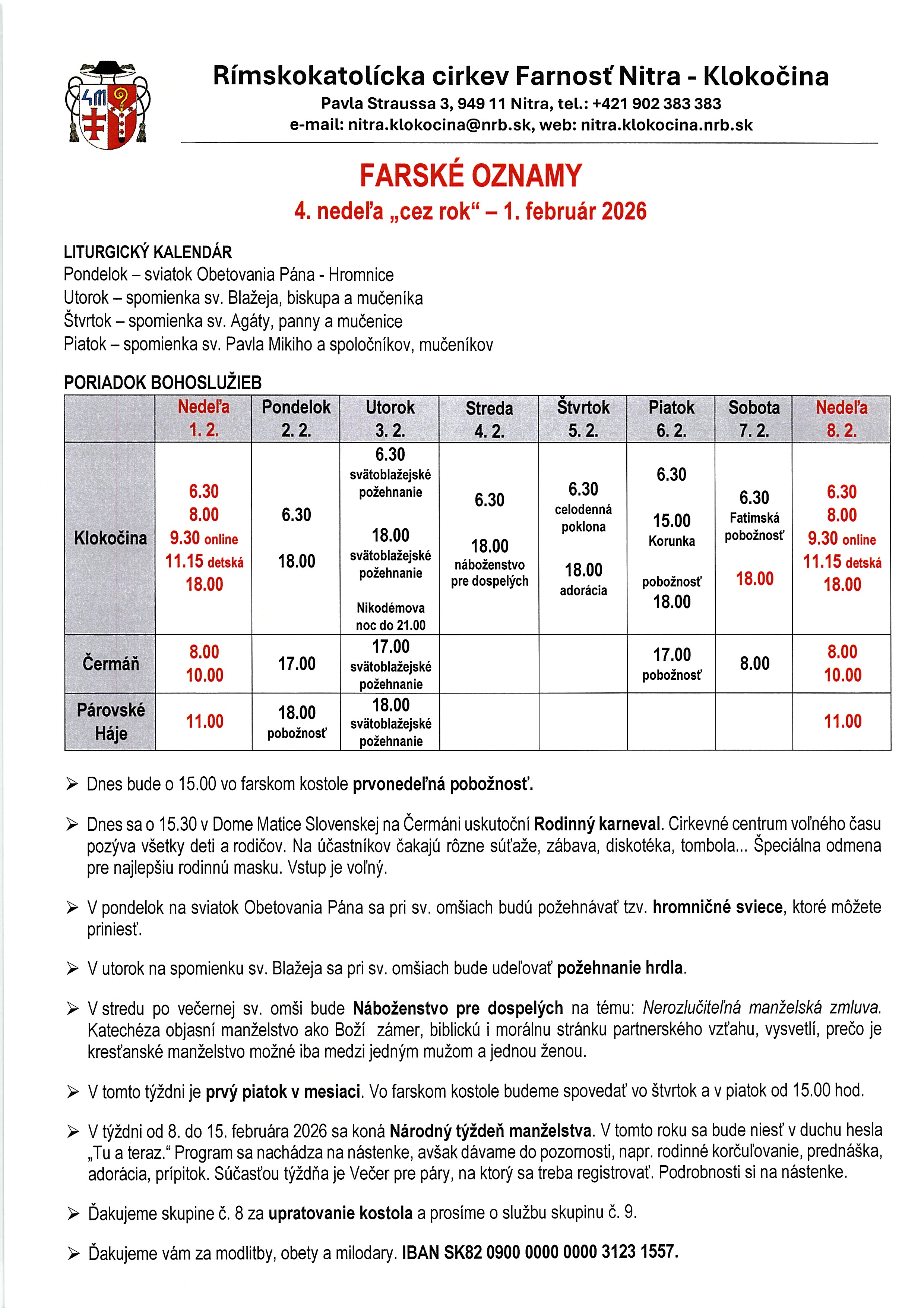 Dnes sa o 15.30 v Dome Matice Slovenskej na Čermáni uskutoční Rodinný karneval. Cirkevné centrum voľného času pozýva všetky deti a rodičov. Na účastníkov čakajú rôzne súťaže, zábava, diskotéka, tombola… Špeciálna odmena pre najlepšiu rodinnú masku. Vstup je voľný.