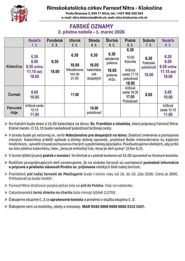 V stredu bude po večernej sv. omši Náboženstvo pre dospelých na tému: Sviatosť zmierenia a pomazania chorých. Katechéza priblíži spôsob a účinky dobrej spovede, predstaví Božie milosrdenstvo ku kajúcim hriešnikom, vysvetlí zmysel pomazania chorých a podmienky jej prijatia. Povzbudzujeme všetkých, aby prišli na túto pôstnu katechézu, lebo „teraz je milostivý čas, teraz je deň spásy” (2 Kor 6,2).