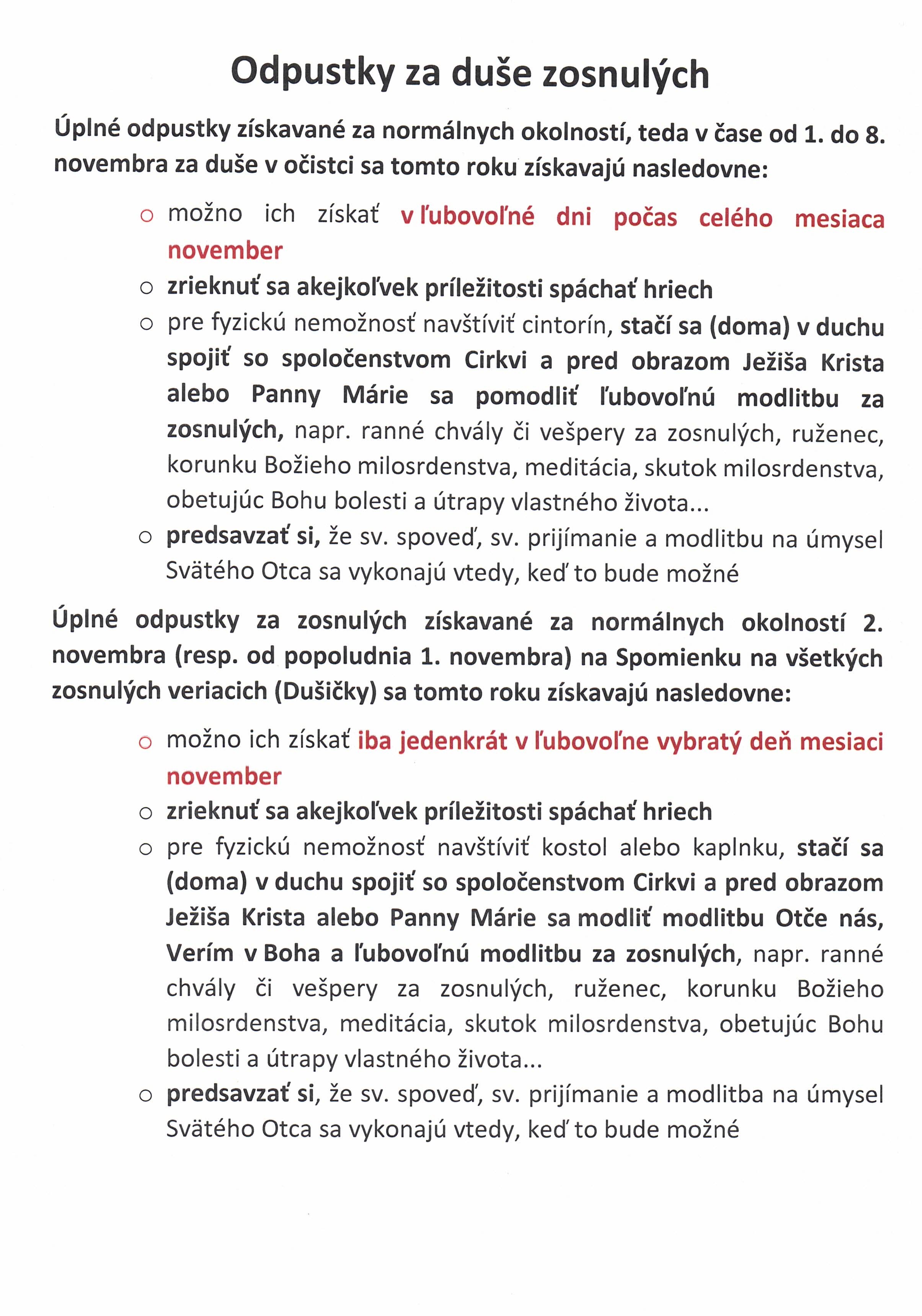 Všetky sv. omše v našej farnosti sa podľa Covid automatu riadia režimom ZÁKLAD – to znamená, prichádzať môžu všetci s dodržaním príslušných opatrení daného protokolu (obmedzený počet účastníkov). Výnimkou je sv. omša v nedeľu o 9.30, ktorá je v režime ZAOČKOVANÍ – to znamená bez obmedzenia počtu. Pri všetkých režimoch platí povinnosť vytvoriť zoznam účastníkov a v interiéri kostola používať respirátor.