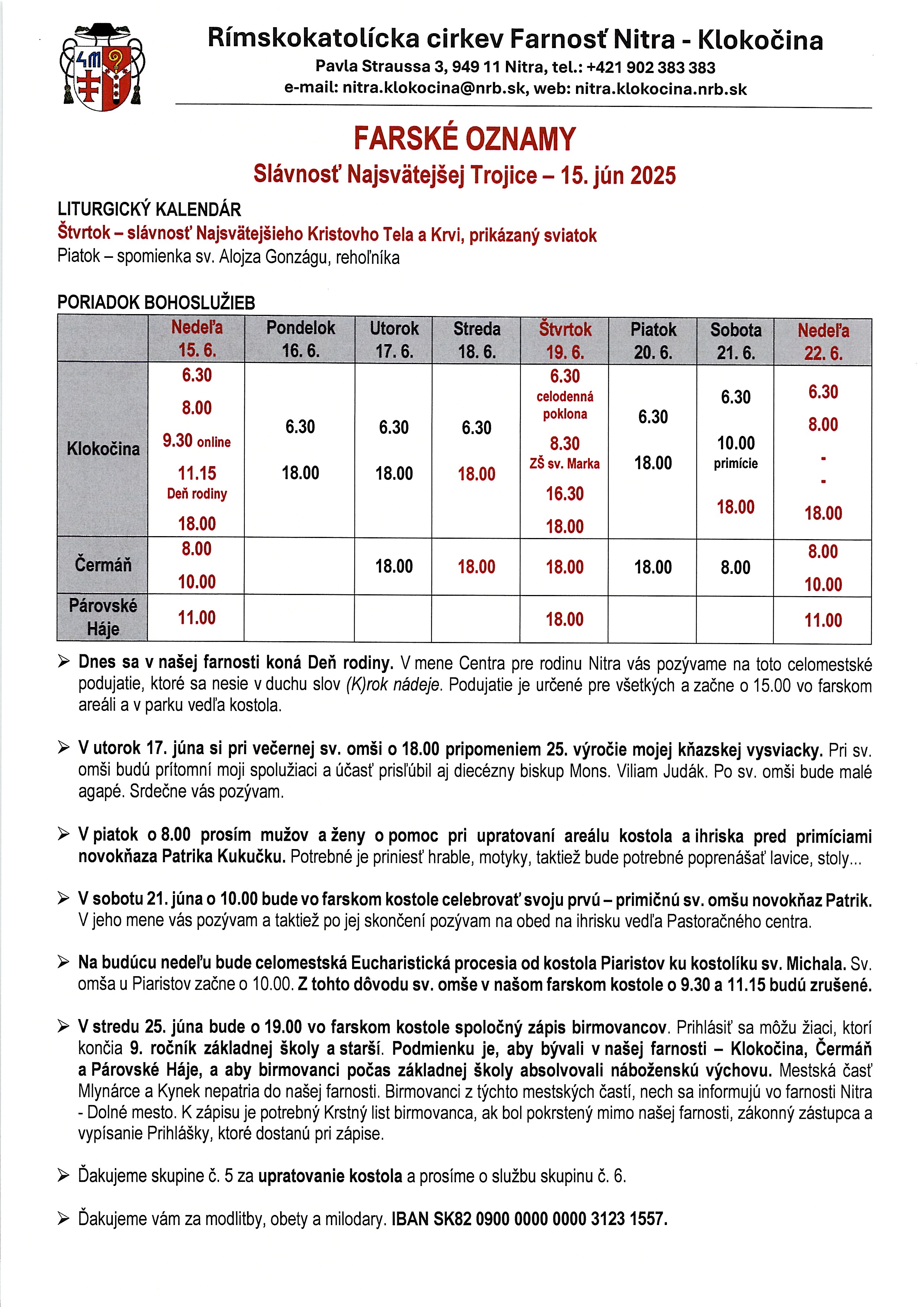 Na budúcu nedeľu bude celomestská Eucharistická procesia od kostola Piaristov ku kostolíku sv. Michala. omša u Piaristov začne o 10.00. Z tohto dôvodu sv. omše v našom farskom kostole o 9.30 a 11.15 budú zrušené.
