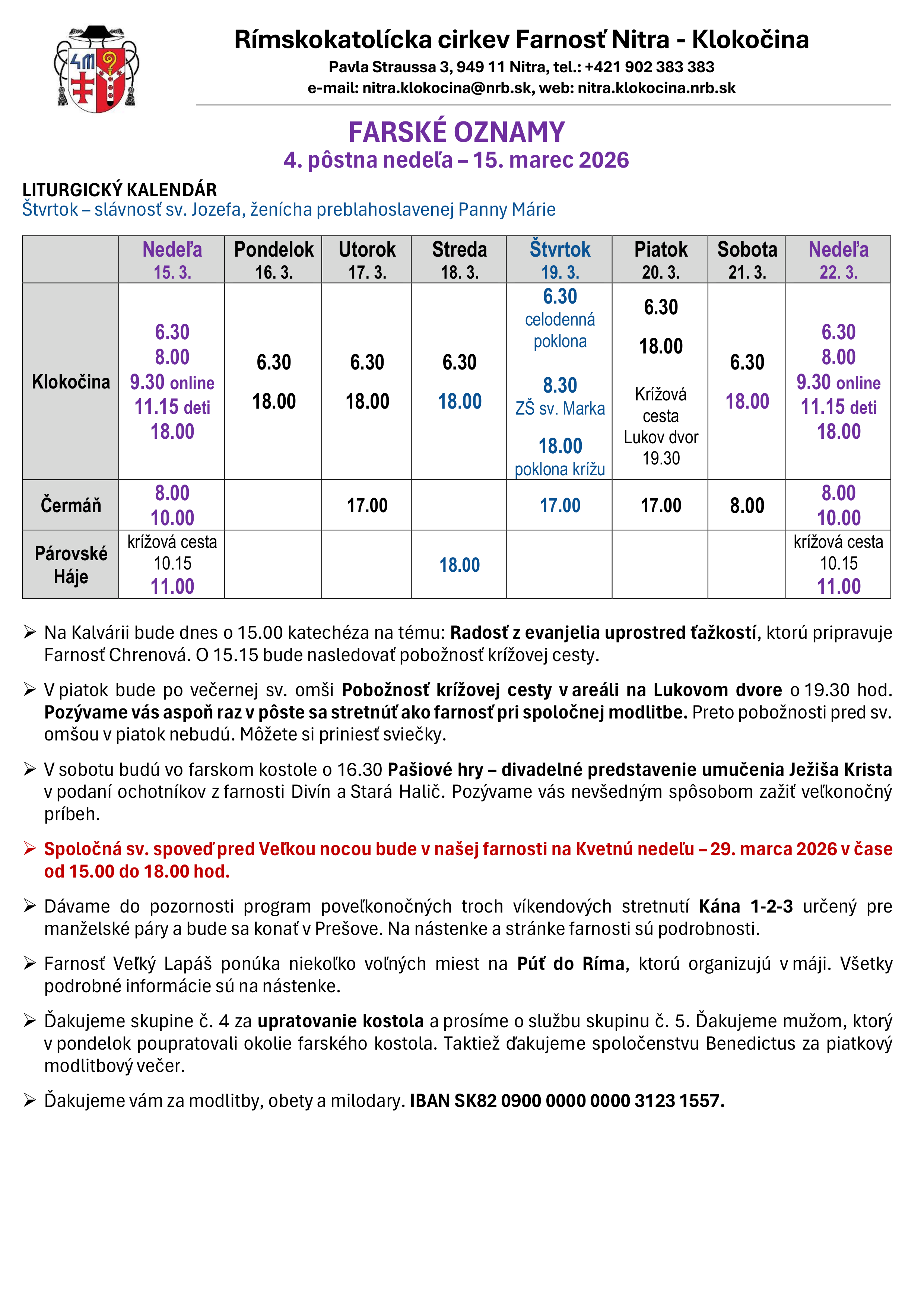V piatok bude po večernej sv. omši Pobožnosť krížovej cesty v areáli na Lukovom dvore o 19.30 hod. Pozývame vás aspoň raz v pôste sa stretnúť ako farnosť pri spoločnej modlitbe. Preto pobožnosti pred sv. omšou v piatok nebudú. Môžete si priniesť sviečky.