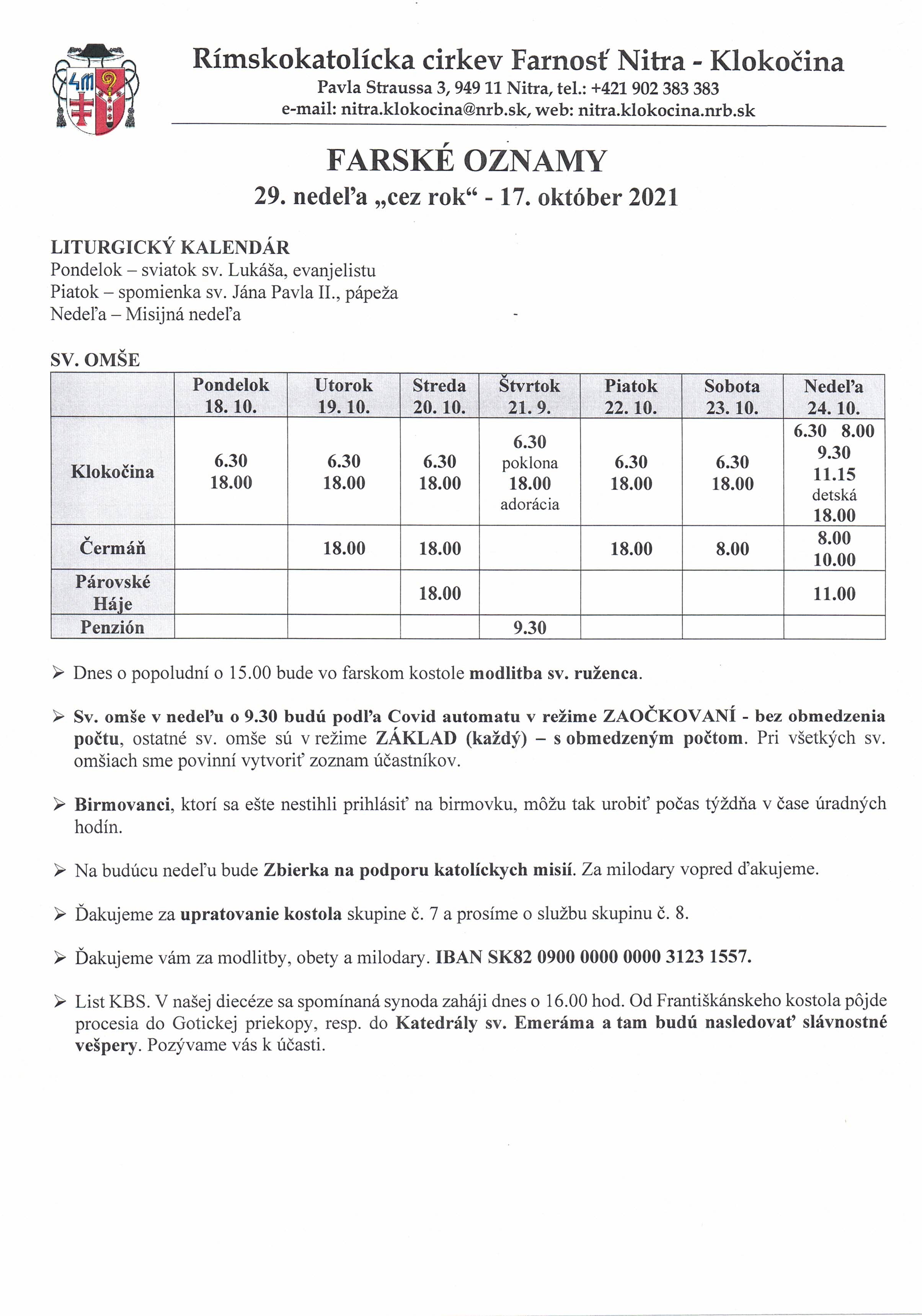 Všetky sv. omše v našej farnosti sa podľa Covid automatu riadia režimom ZÁKLAD – to znamená, prichádzať môžu všetci s dodržaním príslušných opatrení daného protokolu (obmedzený počet účastníkov). Výnimkou je sv. omša v nedeľu o 9.30, ktorá je v režime ZAOČKOVANÍ – to znamená bez obmedzenia počtu. Pri všetkých režimoch platí povinnosť vytvoriť zoznam účastníkov a v interiéri kostola používať respirátor.