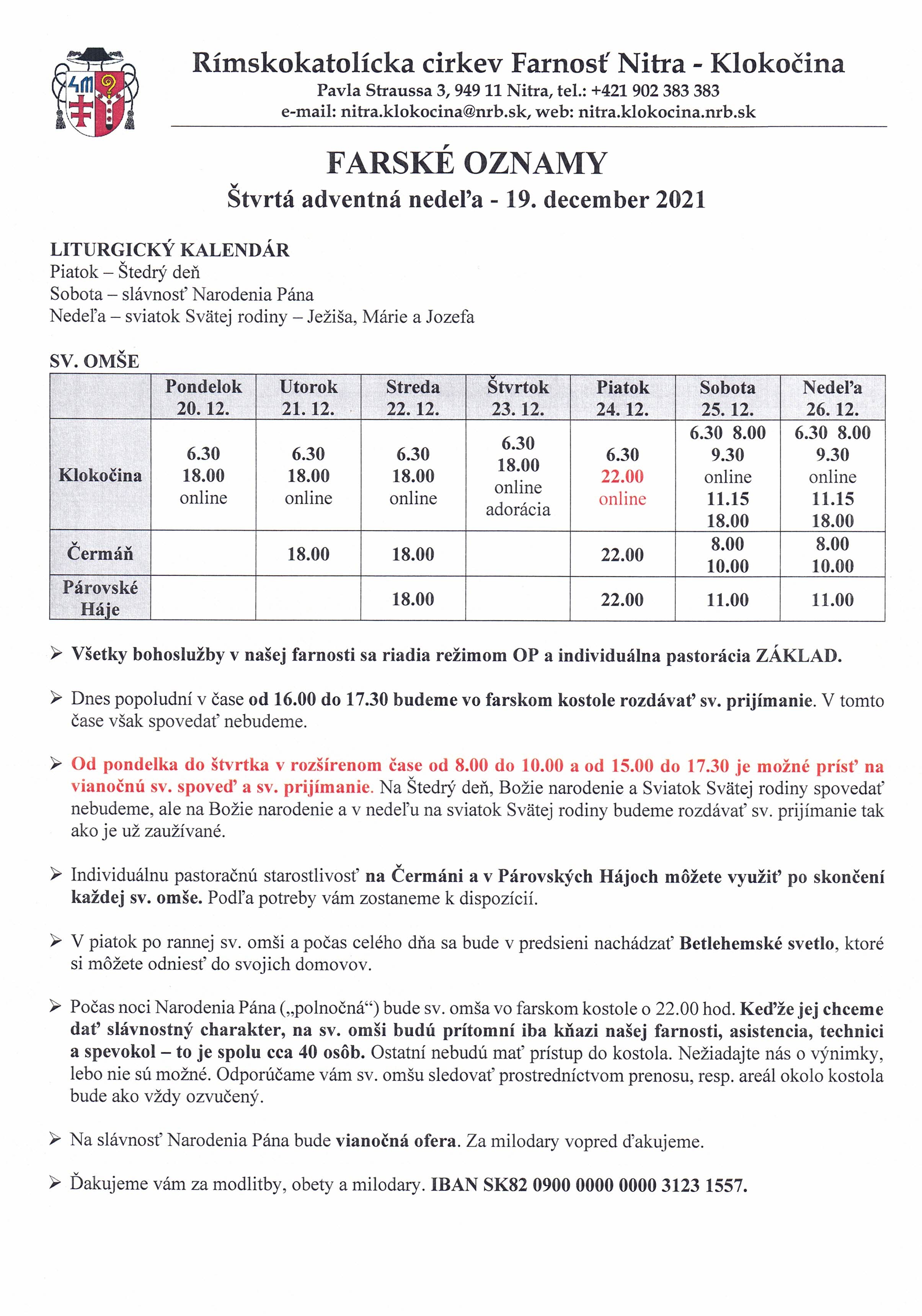 Od 10. decembra 2021 je opäť možné sláviť bohoslužby avšak s obmedzeniami, ktoré sú v praxi takmer nedosiahnuteľné, preto je otázka, či ich môžeme nazvať „verejné“. Počet veriacich podľa nových usmernení vo farskom kostole na Klokočine počas bohoslužby môže byť cca 40 osôb (25 m2/1 osoba), v kostole na Čermáni max. 30 osôb a v Párovských Hájoch max. 30 osôb. Všetky bohoslužby môžu byť iba v režime OP – teda kompletne očkovaní a „prekonaní“.
