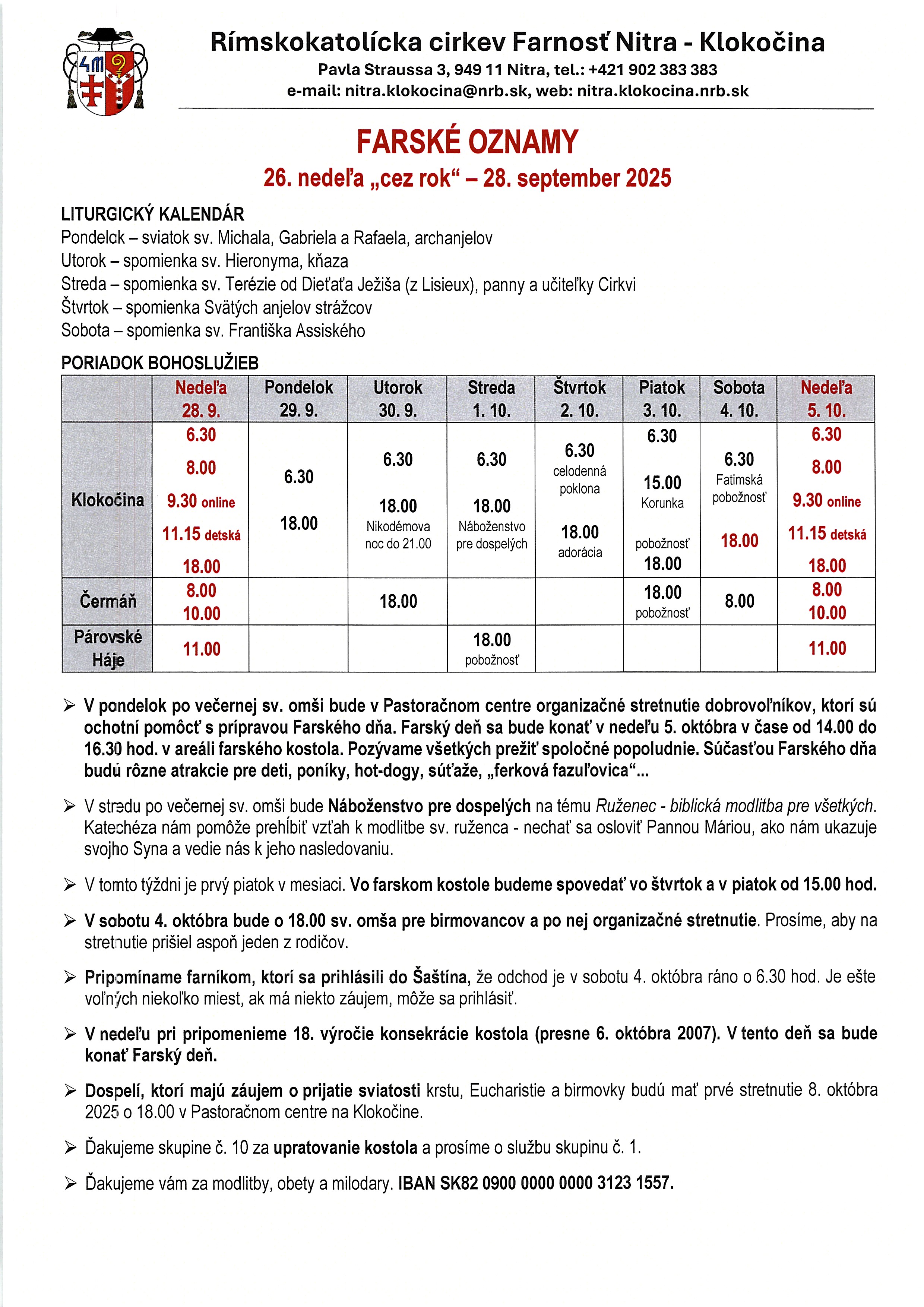 V pondelok po večernej sv. omši bude v Pastoračnom centre organizačné stretnutie dobrovoľníkov, ktorí sú ochotní pomôcť s prípravou Farského dňa. Farský deň sa bude konať v nedeľu 5. októbra v čase od 14. do 16.30 hod. v areáli farského kostola. Pozývame všetkých prežiť spoločné popoludnie. Súčasťou Farského dňa budú rôzne atrakcie pre deti, poníky, hot-dogy, súťaže, „ferková fazuľovica“…
