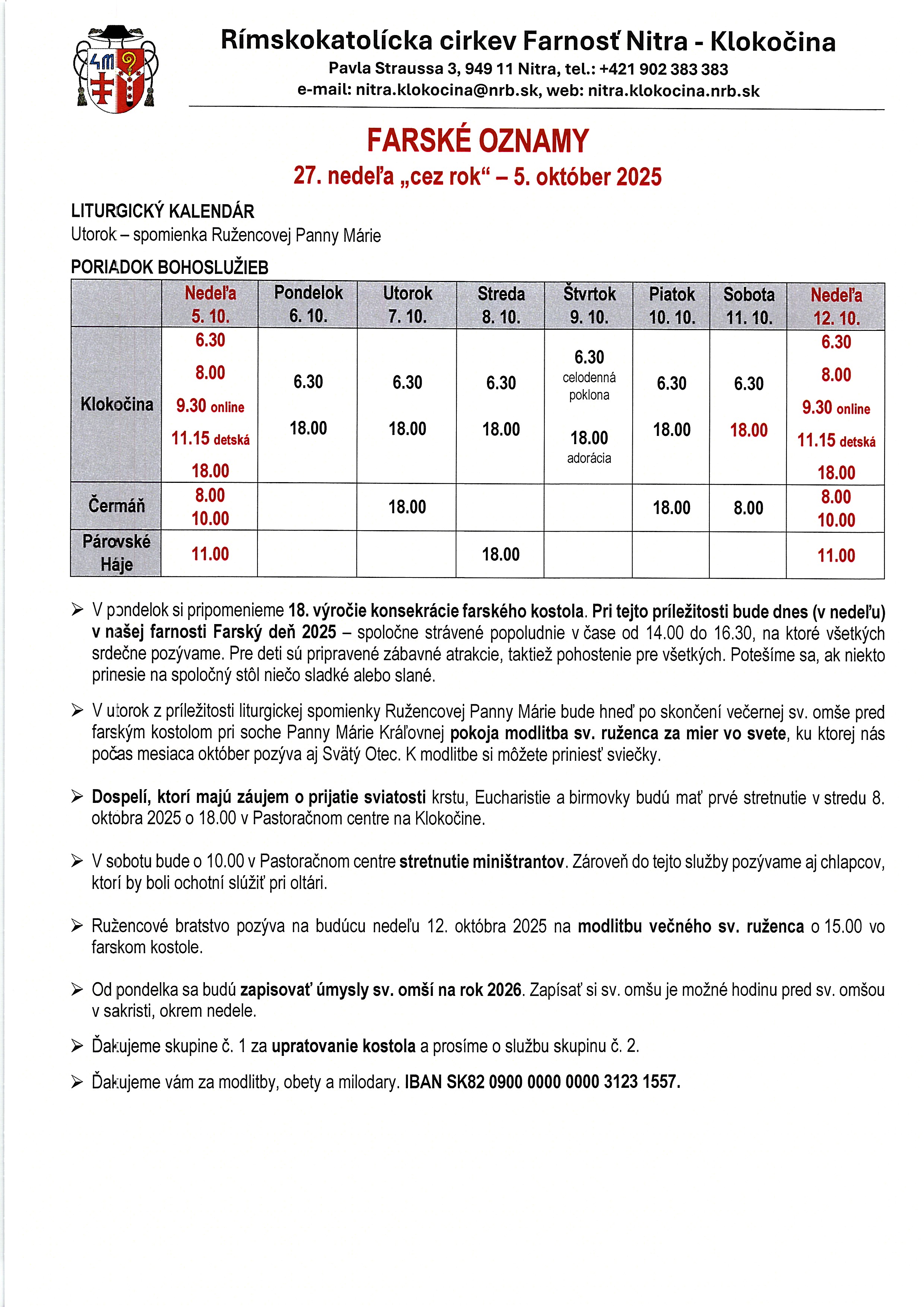 V utorok z príležitosti liturgickej spomienky Ružencovej Panny Márie bude hneď po skončení večernej sv. omše pred farským kostolom pri soche Panny Márie Kráľovnej pokoja modlitba sv. ruženca za mier vo svete, ku ktorej nás počas mesiaca október pozýva aj Svätý Otec. K modlitbe si môžete priniesť sviečky.