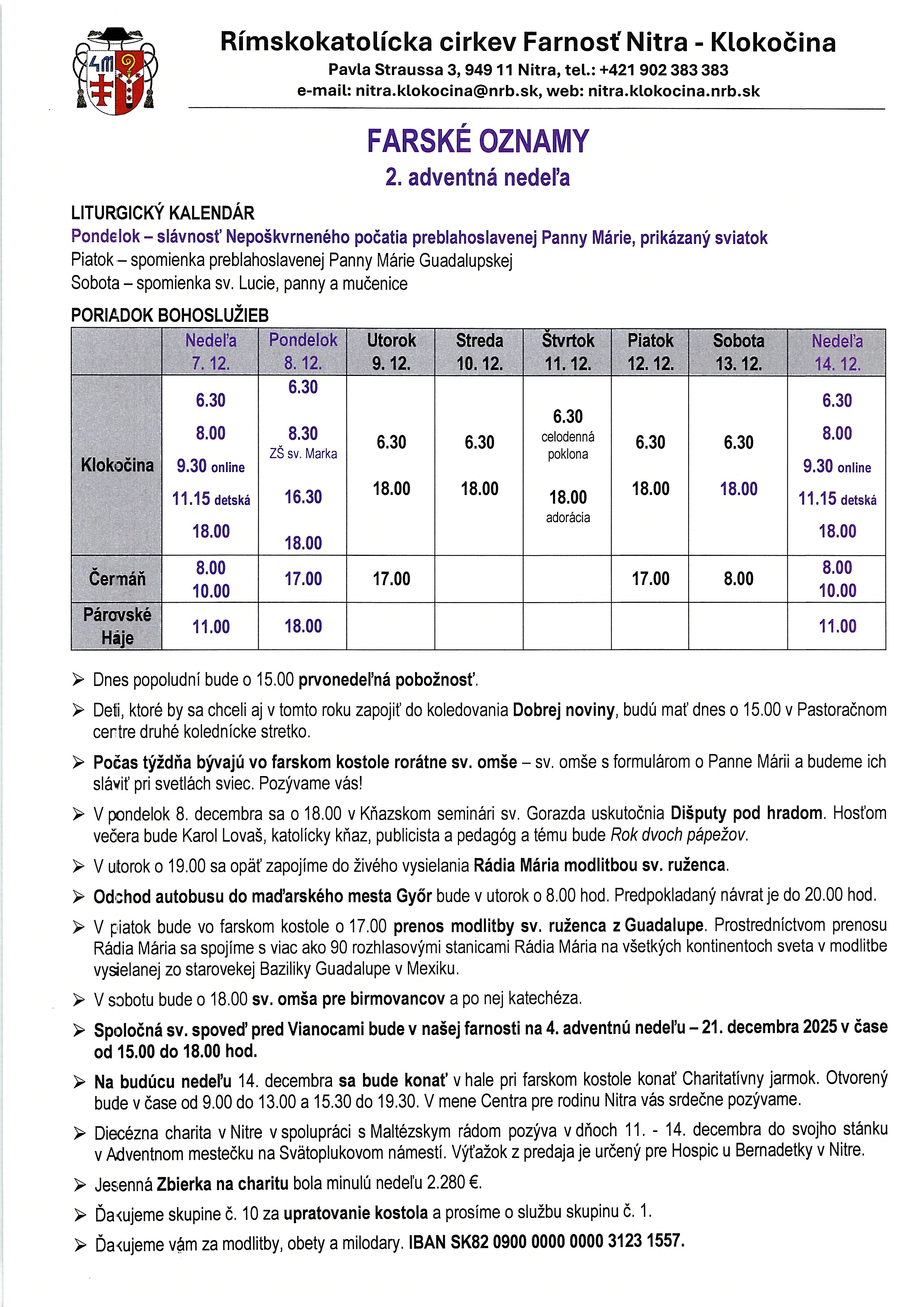 V piatok bude vo farskom kostole o 17.00 prenos modlitby sv. ruženca z Guadalupe. Prostredníctvom prenosu Rádia Mária sa spojíme s viac ako 90 rozhlasovými stanicami Rádia Mária na všetkých kontinentoch sveta v modlitbe vysielanej zo starovekej Baziliky Guadalupe v Mexiku.