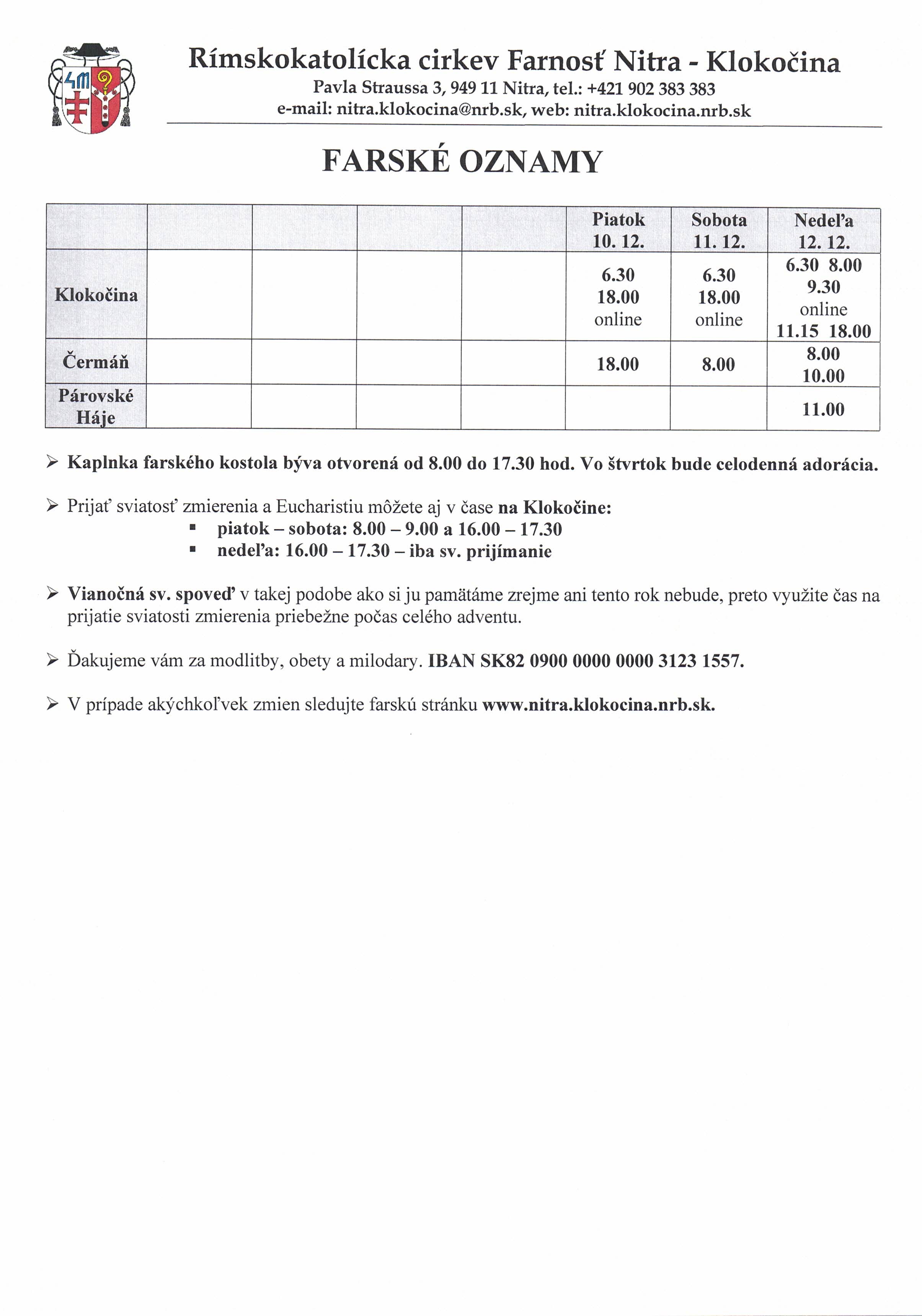 Sv. omše budú vo všetkých kostoloch našej farnosti v tom čase, ako bývajú za normálnych okolností, avšak v režime OP a s obmedzením maximálneho počtu (40, 30, 30).